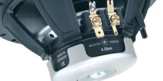 Tieftöner mit zweiteiligem, carbonfaserverstärktem, hochfesten Kunststoffchassis und Polypropylenmembran. Magnetsystem mit Metallabdeckung für zusätzliche Kühlung
